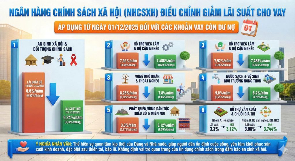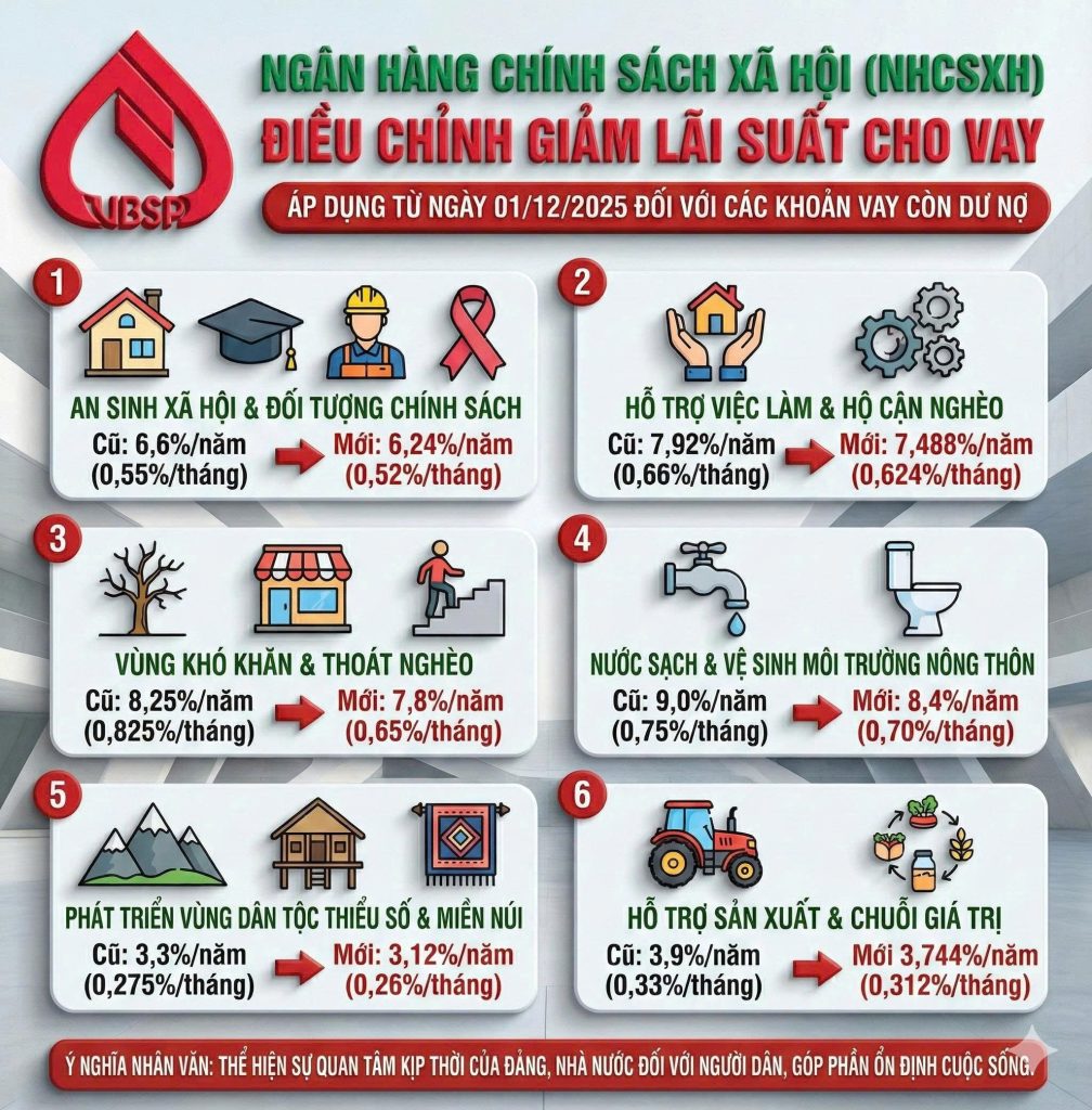 ⏰ Mức lãi suất mới được áp dụng từ ngày 1/12/2025 đối với các khoản vay còn dư nợ tại NHCSXH.