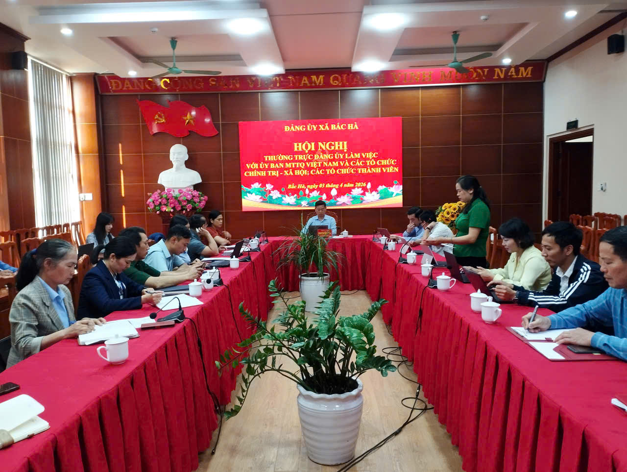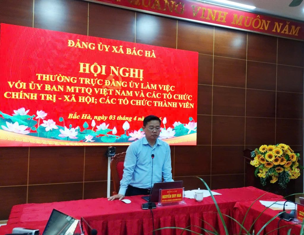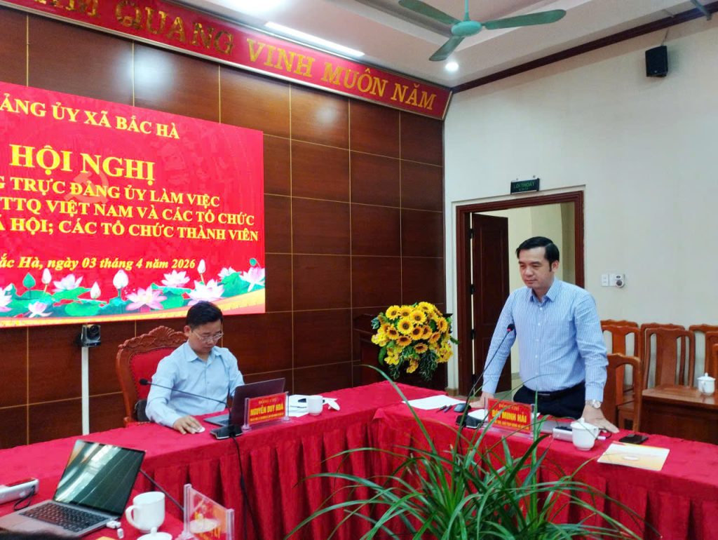 Sáng ngày 03/4/2026, tại Phòng họp Ban chấp hành – Nhà Văn hóa các dân tộc xã Bắc Hà, Thường trực Đảng ủy xã đã tổ chức Hội nghị làm việc với Ủy ban MTTQ Việt Nam xã và các tổ chức chính trị – xã hội, các tổ chức thành viên nhằm đánh giá kết quả thực hiện nhiệm vụ quý I và triển khai phương hướng, nhiệm vụ trong thời gian tới. Hội nghị do đồng chí Nguyễn Duy Hòa, Tỉnh ủy viên, Bí thư Đảng ủy, Chủ tịch HĐND xã chủ trì.
