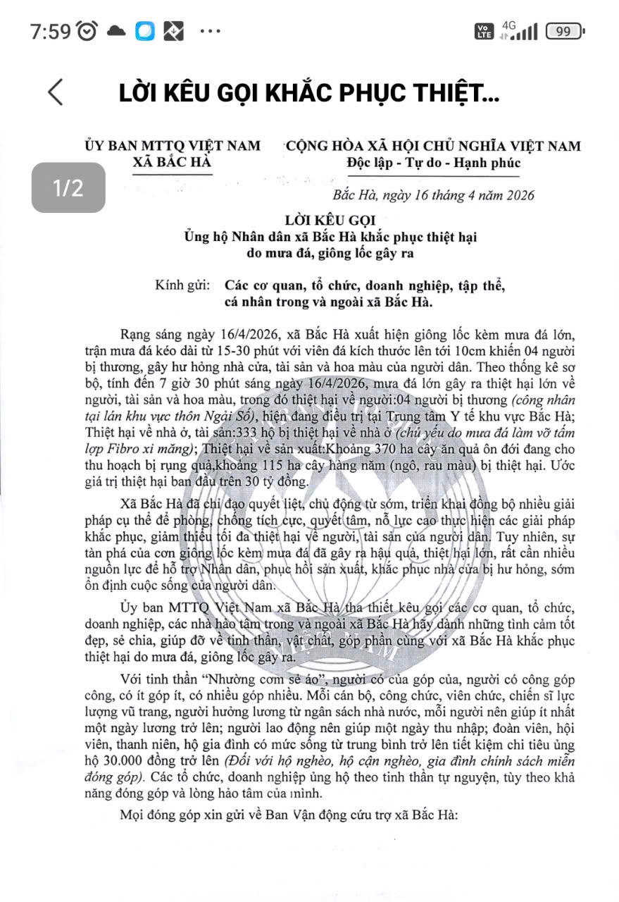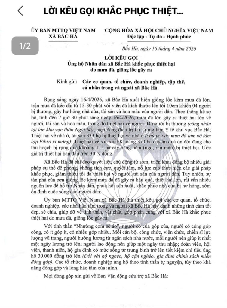 Rạng sáng 16/4/2026, trên địa bàn xã Bắc Hà xảy ra giông lốc kèm mưa đá lớn, gây thiệt hại nặng nề: 04 người bị thương; 333 hộ dân bị hư hỏng nhà ở; khoảng 370 ha cây ăn quả và 115 ha hoa màu bị ảnh hưởng, tổng thiệt hại ước trên 30 tỷ đồng.